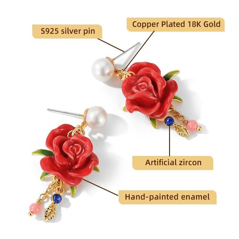 精巧な手描きのエナメル細工で鮮やかな赤い薔薇のディテールが表現されています。