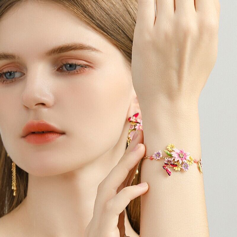 精巧な手描きのエナメル細工で、カラフルな花と蝶のディテールが表現されています。