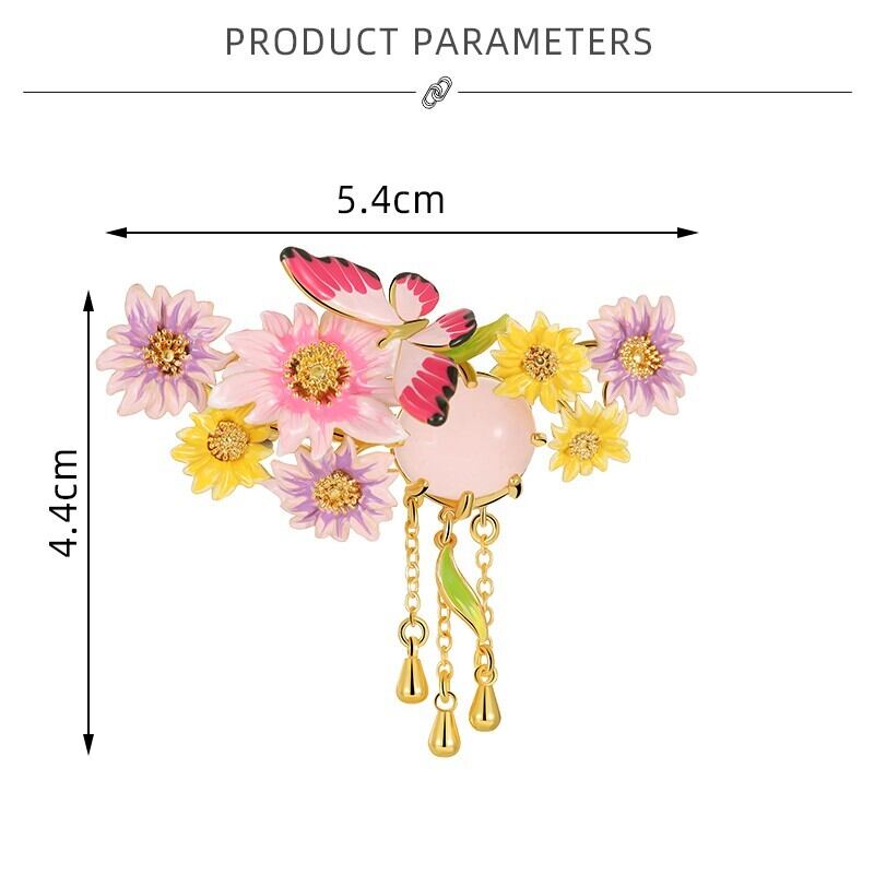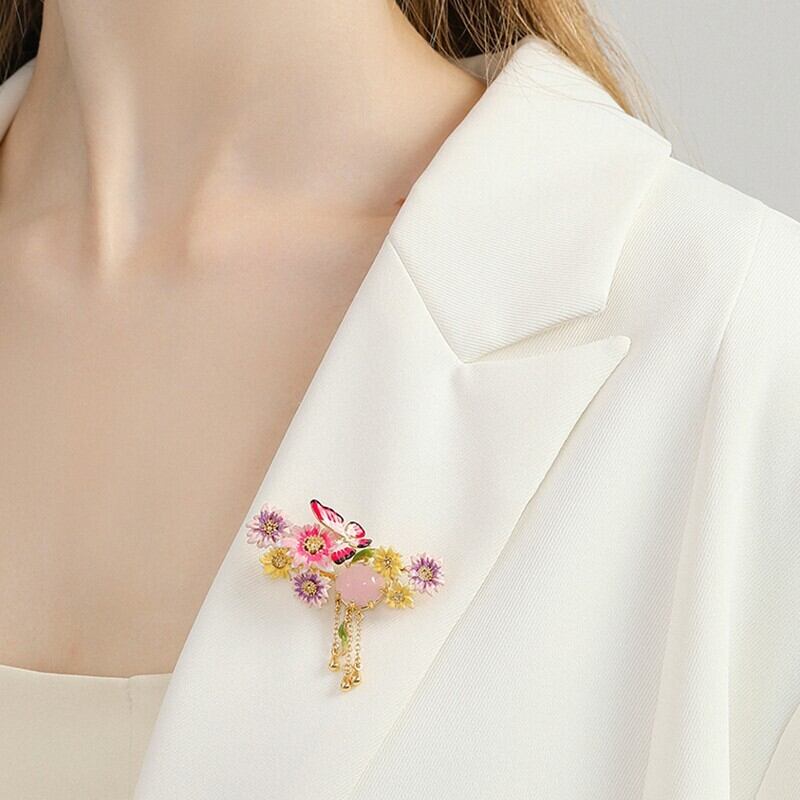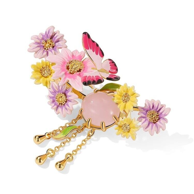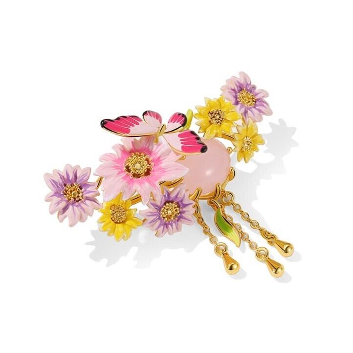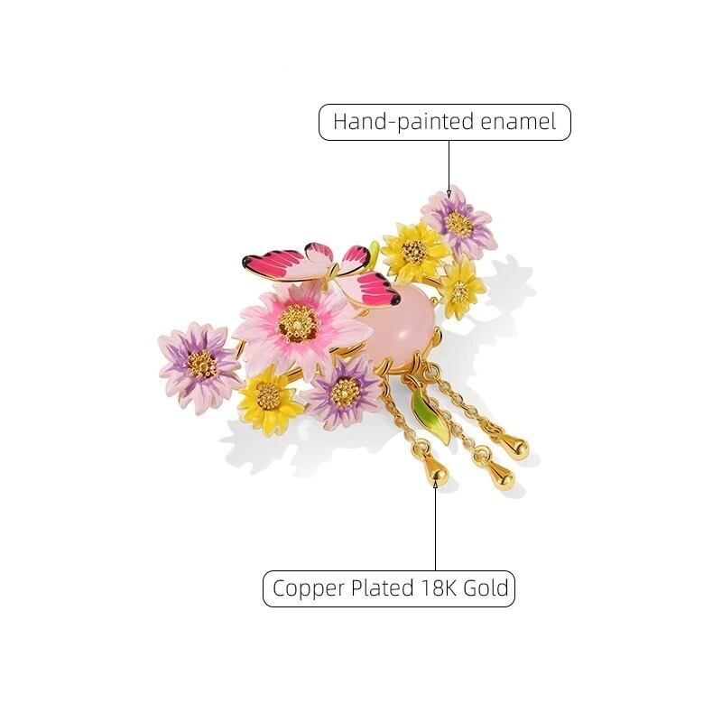 精巧な手描きのエナメル細工で、カラフルな花と蝶のディテールが表現されています。