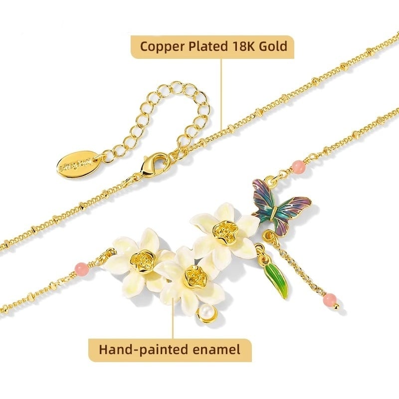 精巧な手描きのエナメル細工で、水仙の花や鮮やかな蝶のディテールが表現されています。