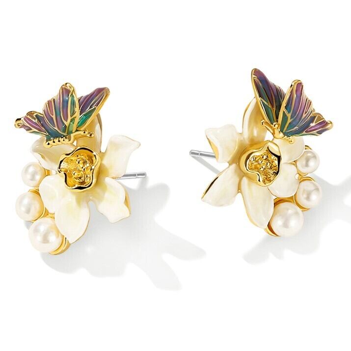 精巧な手描きのエナメル細工で、水仙の花や鮮やかな蝶のディテールが表現されています。