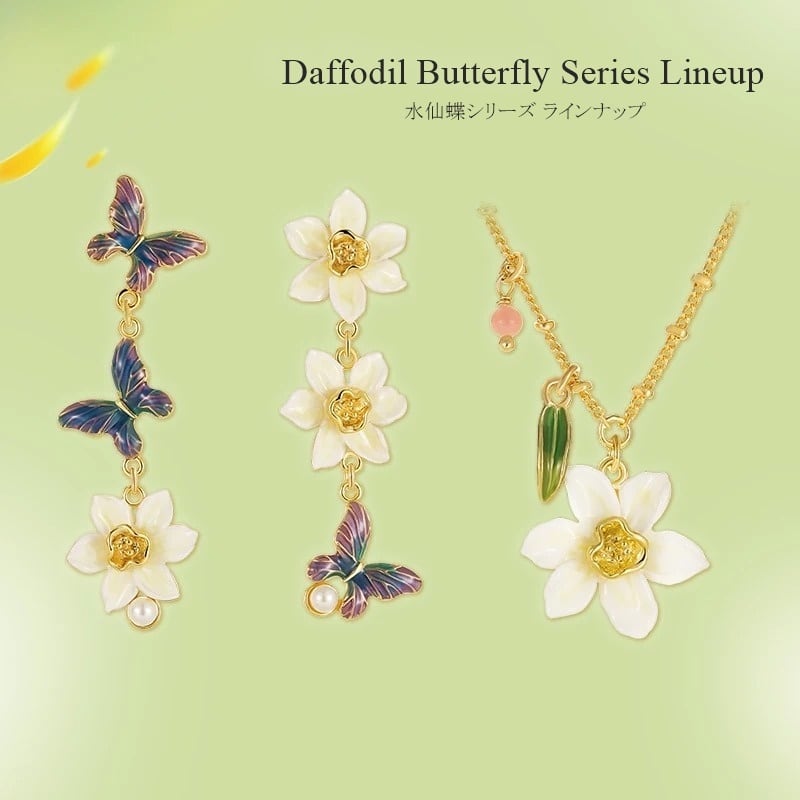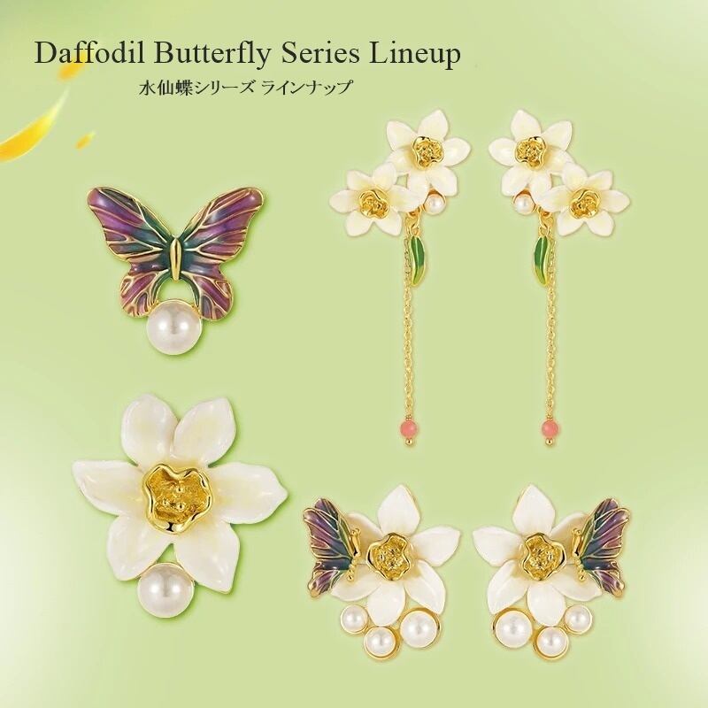 水仙と水仙にとまる蝶からインスピレーションを得た【Daffodil Butterfly Series -水仙蝶-】のアクセサリー。
