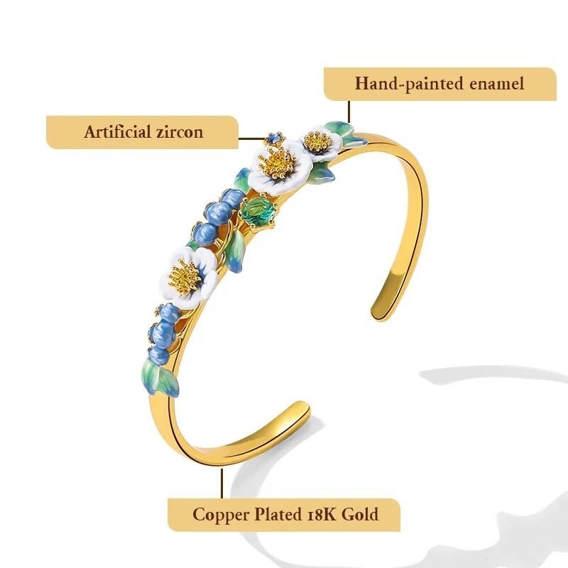 精巧な手描きのエナメル細工で、美しいグラデーションのブルーベリーや花のディテールが表現されています。