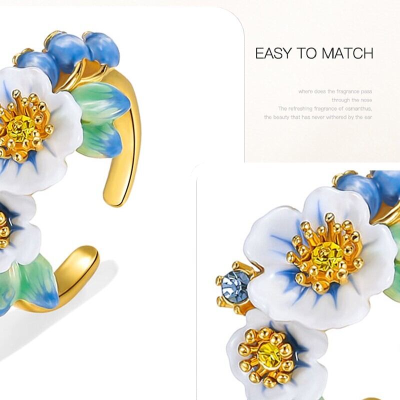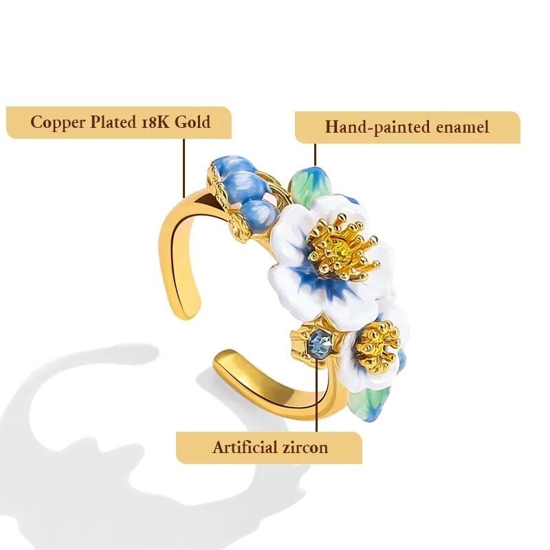 精巧な手描きのエナメル細工で、美しいグラデーションのブルーベリーや花のディテールが表現されています。