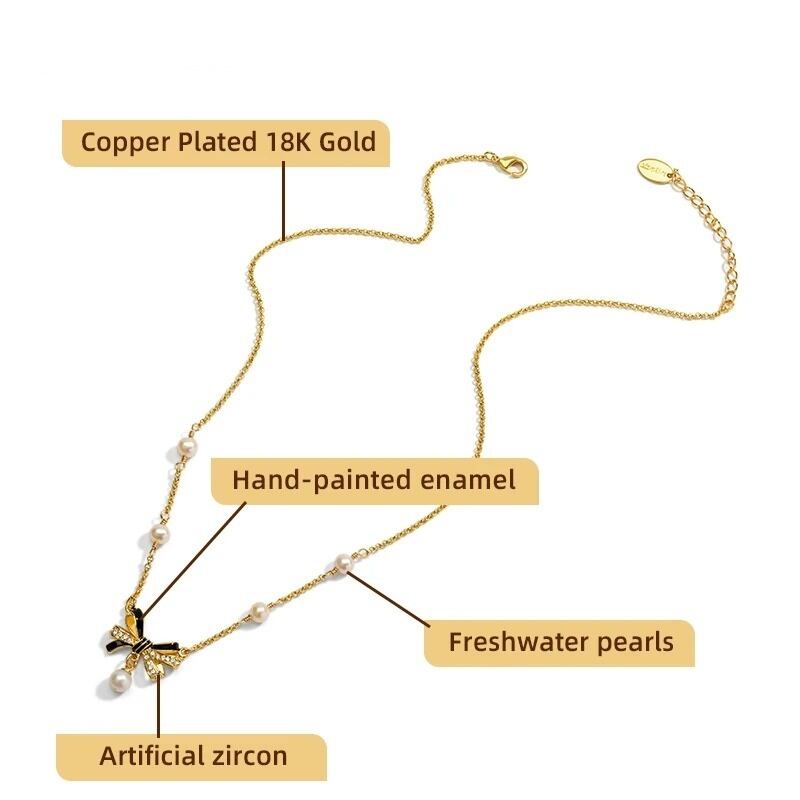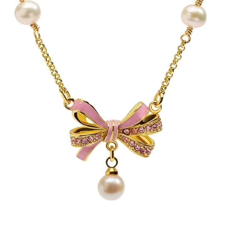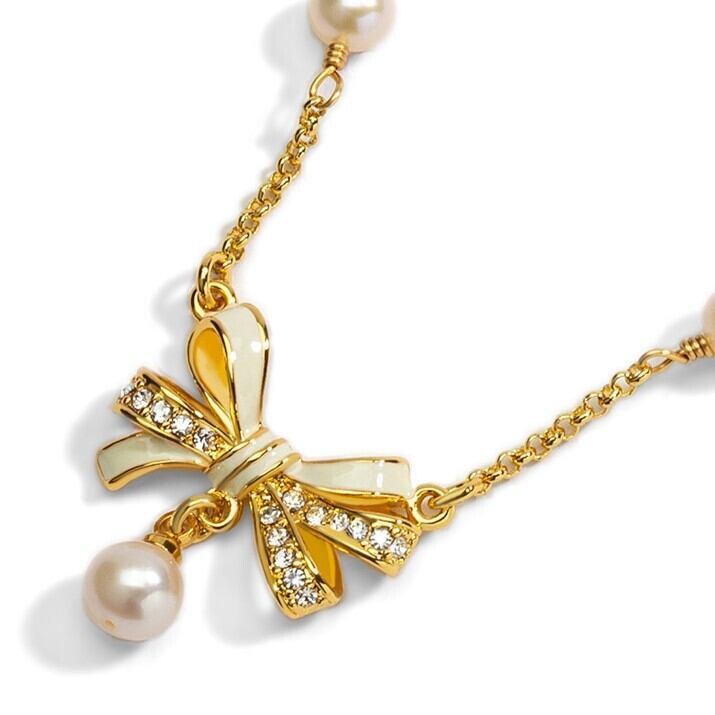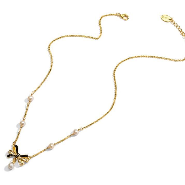 精巧な手描きのエナメル細工とジルコン、パールで、リボン結びのディテールが表現されています。