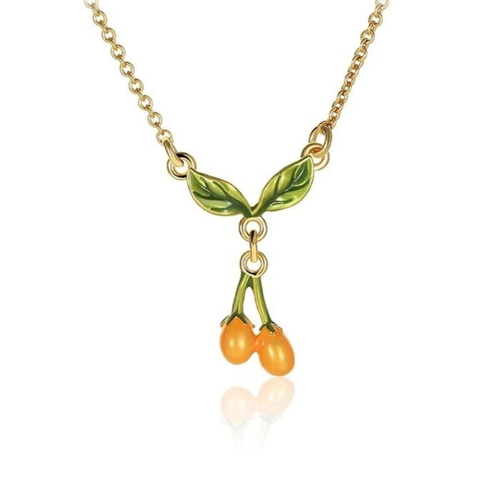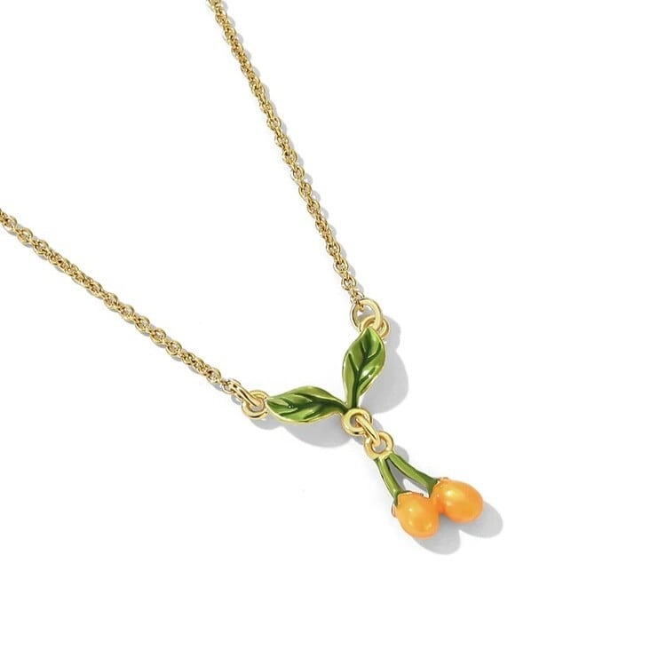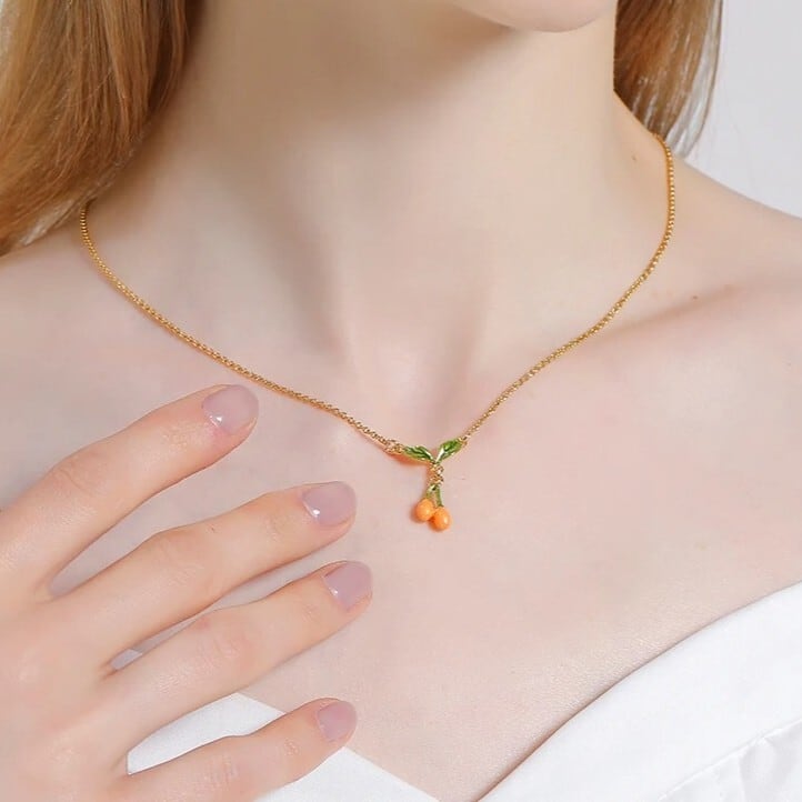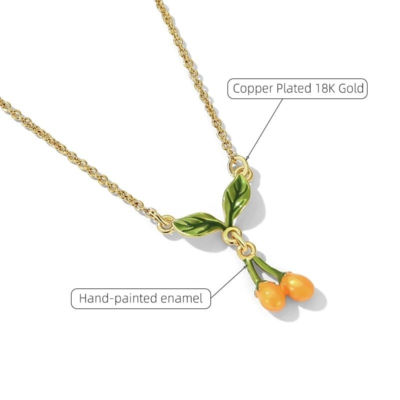 精巧な手描きのエナメル細工で、キンカンオレンジと花のディテールが表現されています。