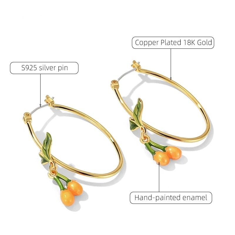 精巧な手描きのエナメル細工で、キンカンオレンジと花のディテールが表現されています。