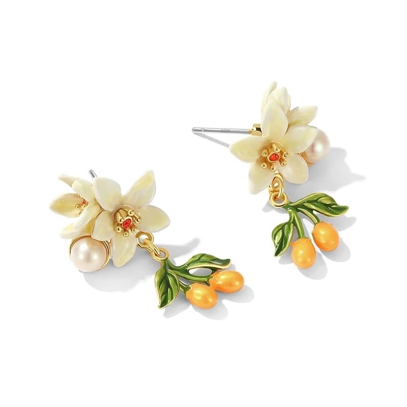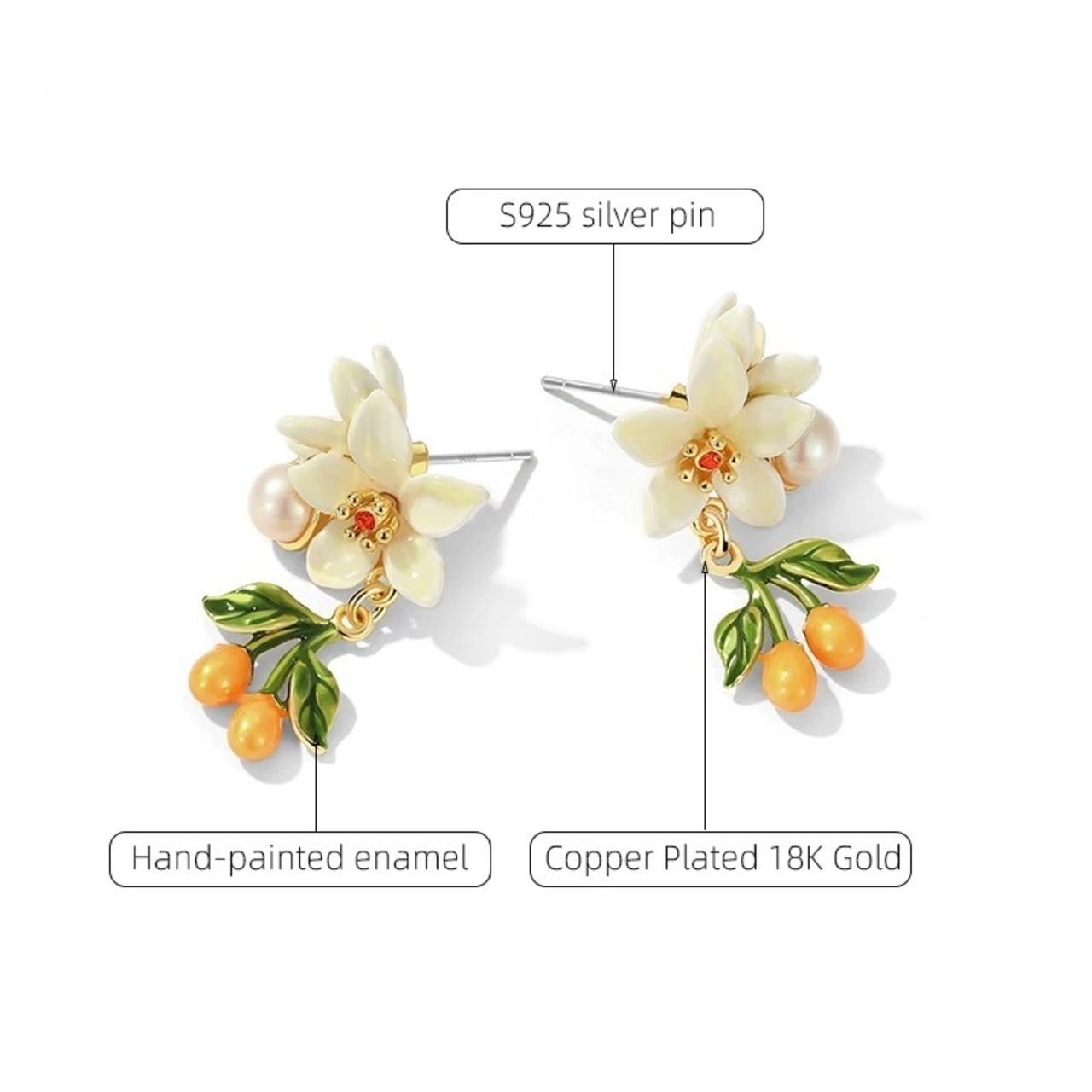 精巧な手描きのエナメル細工で、キンカンオレンジと花のディテールが表現されています。