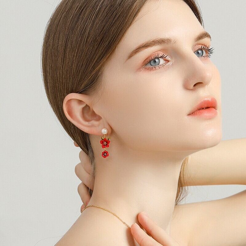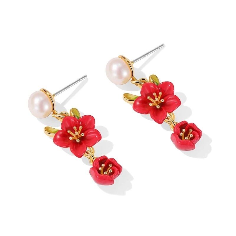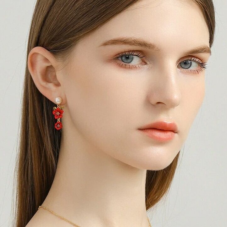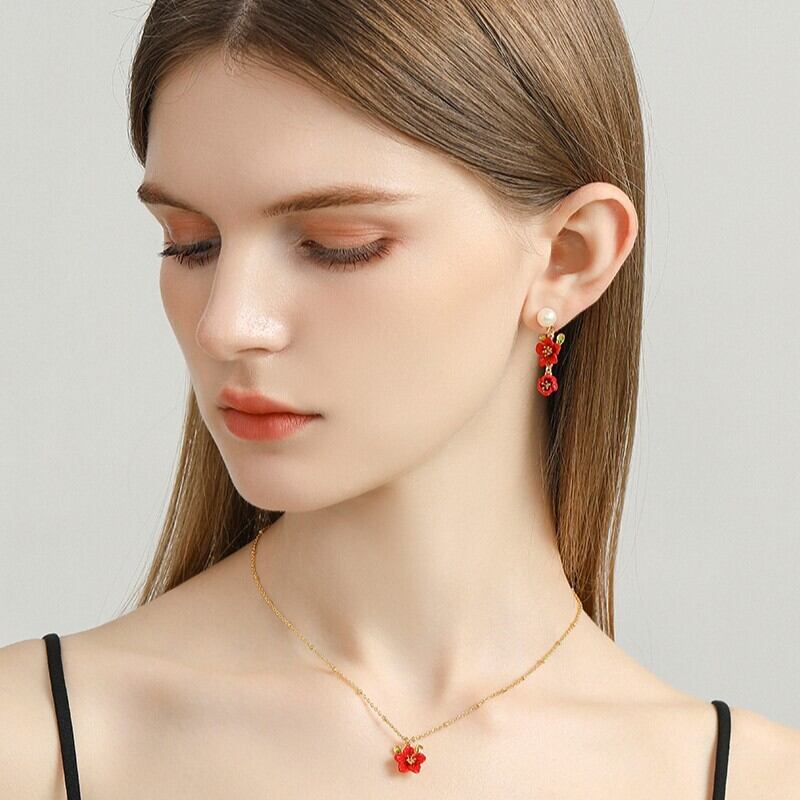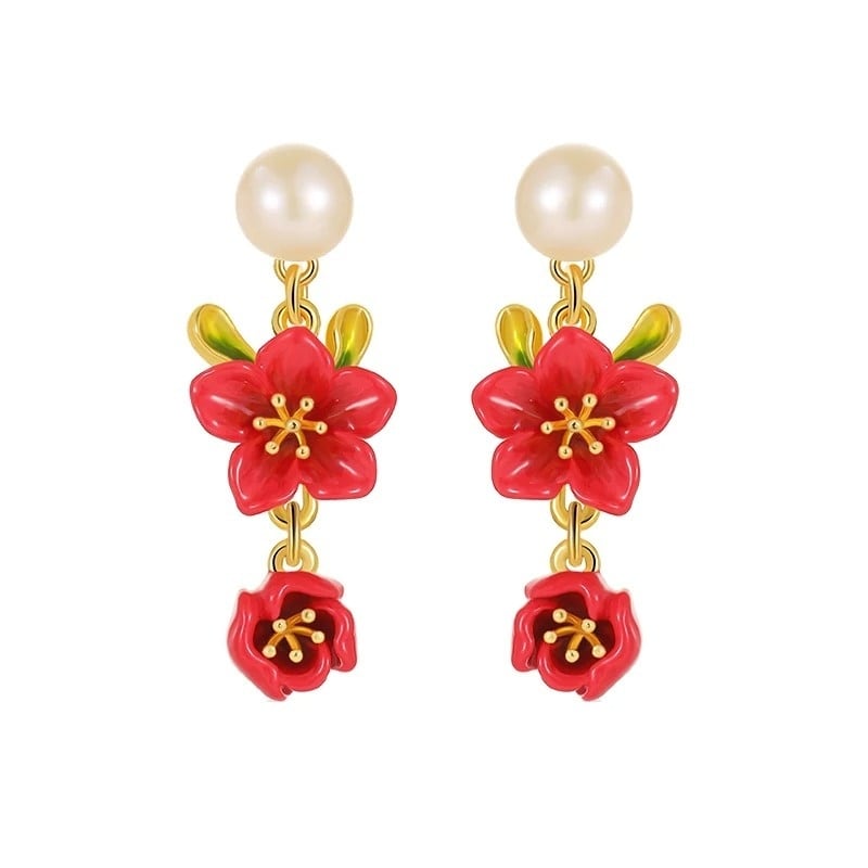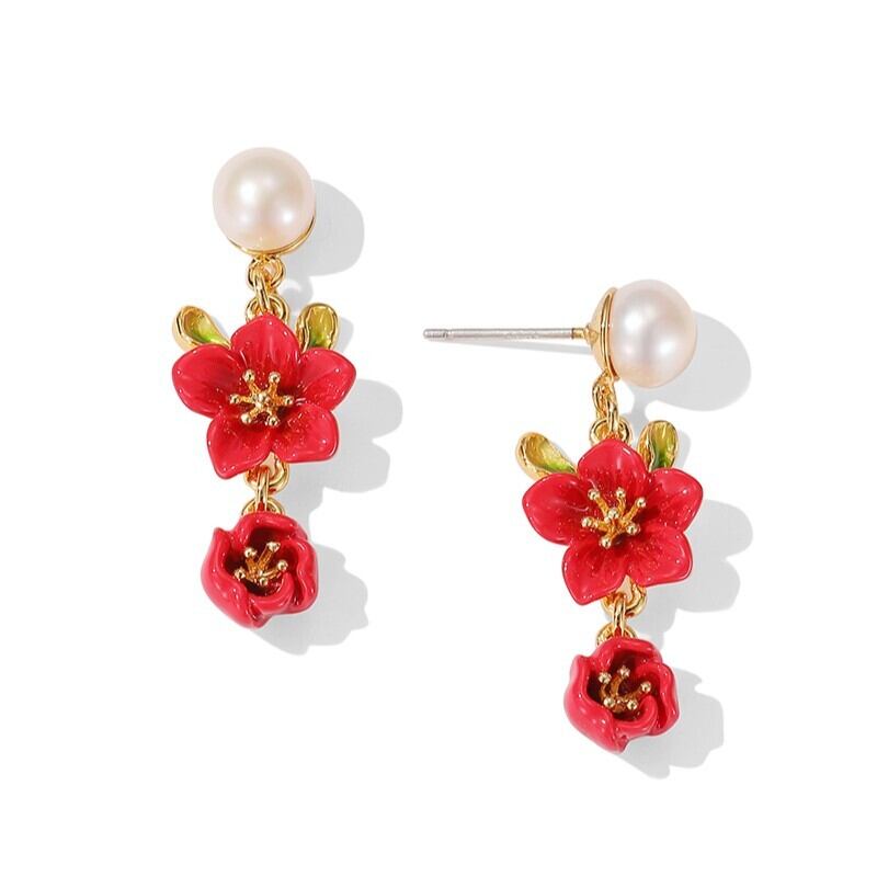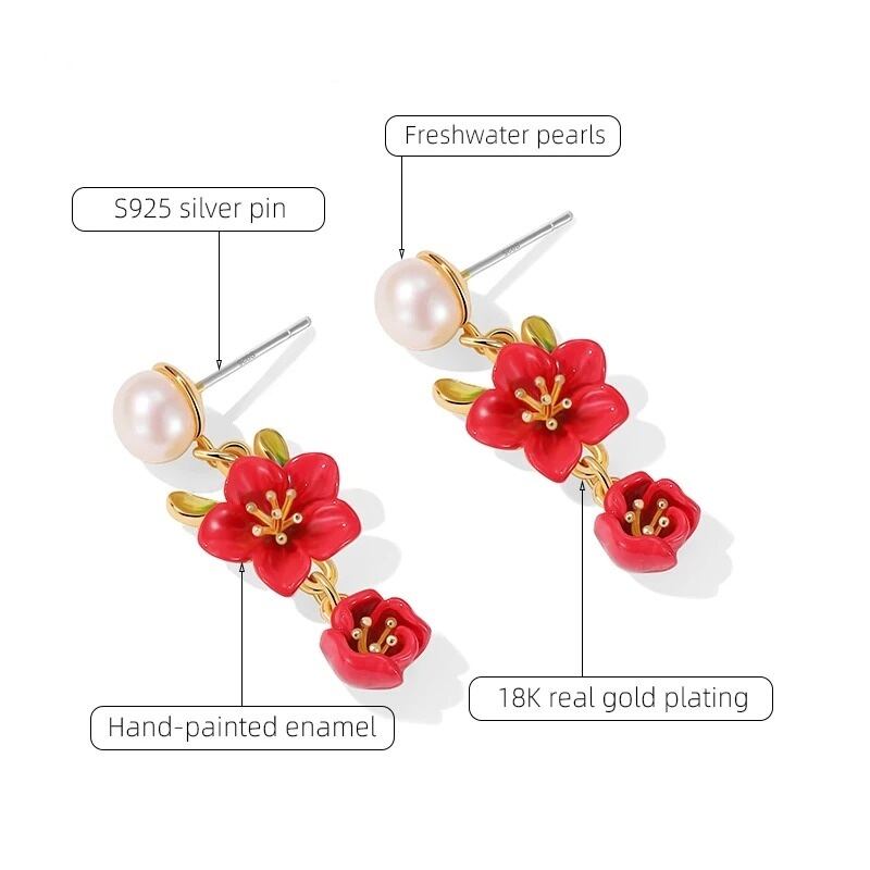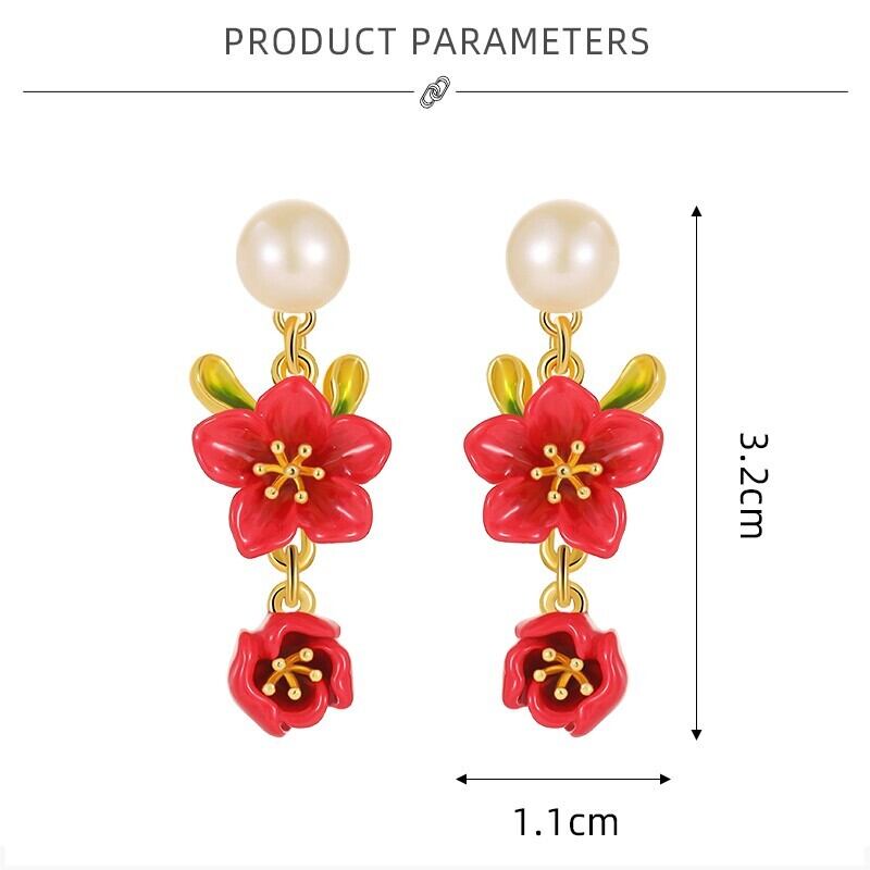 精巧な手描きのエナメル細工で、鮮やかな赤色の花が表現されています。