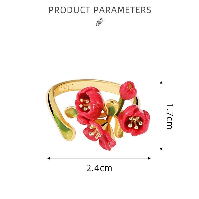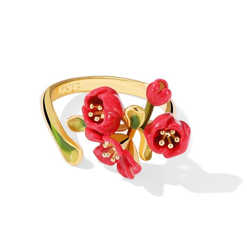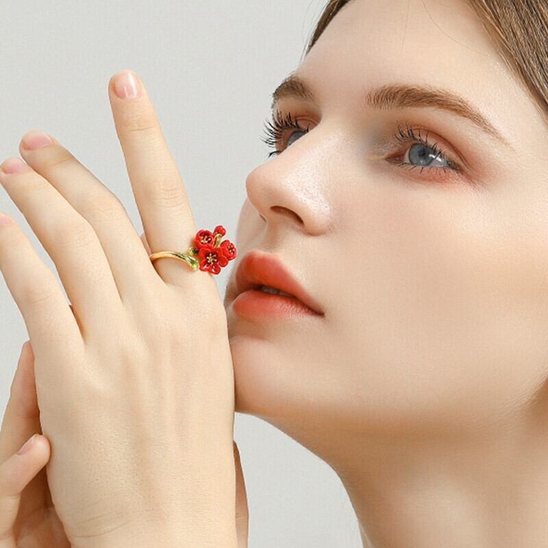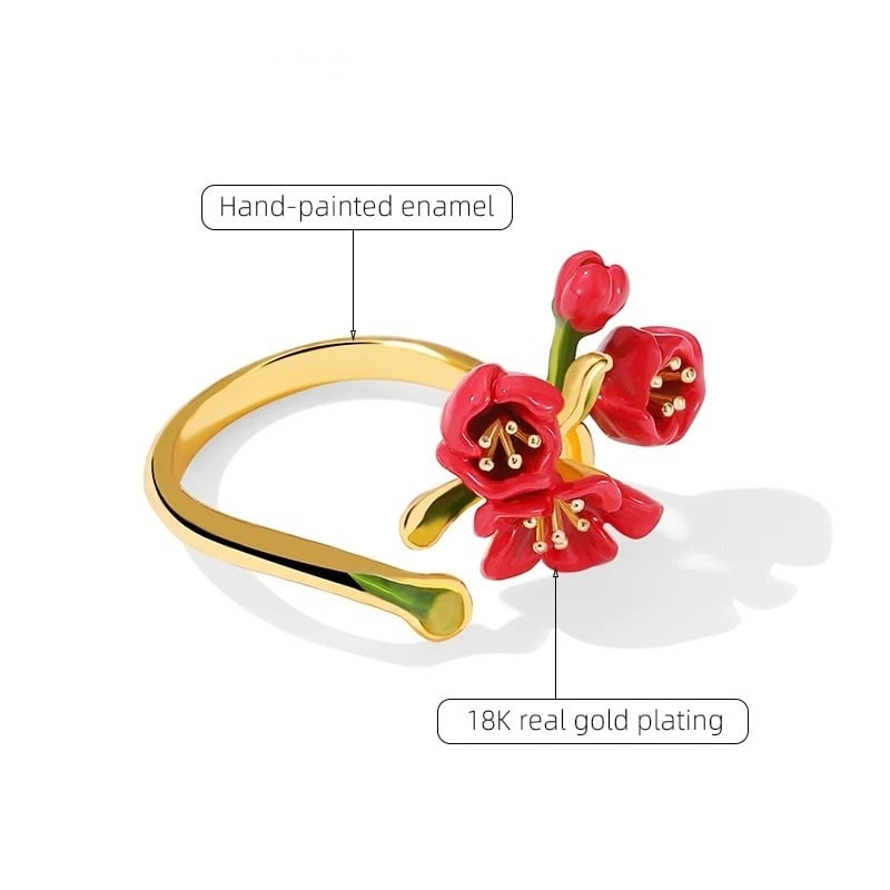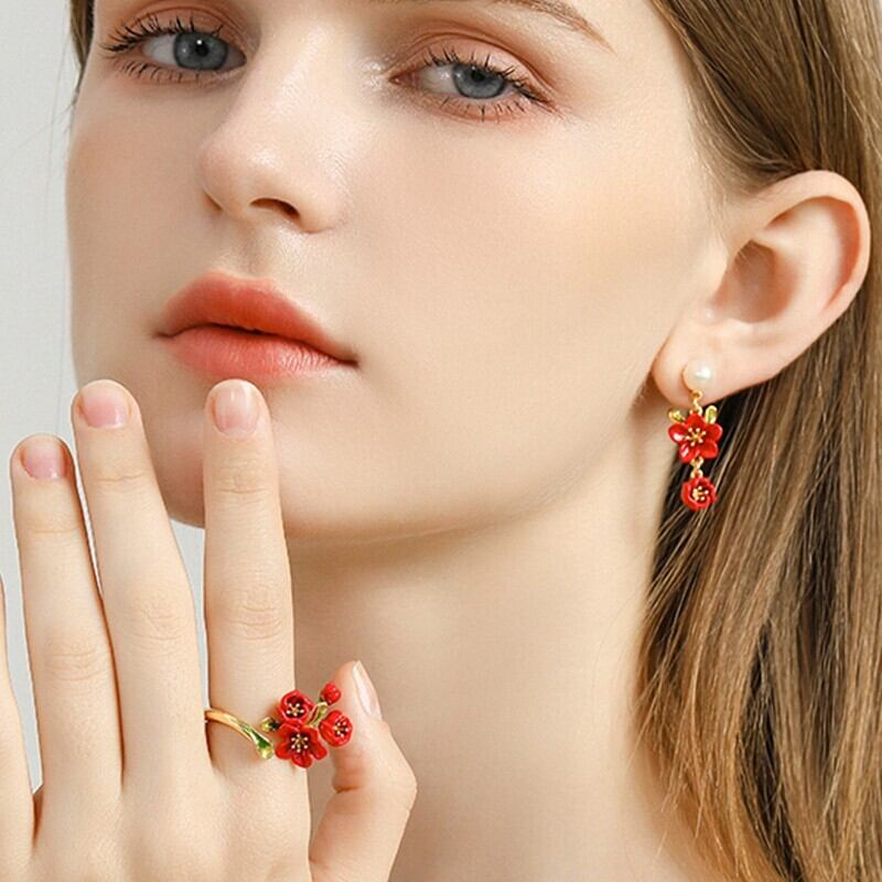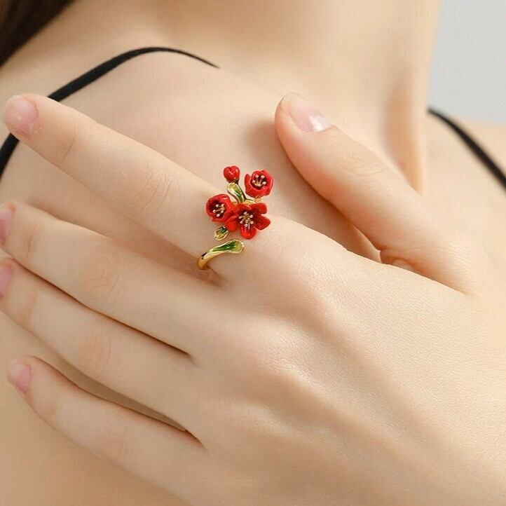 精巧な手描きのエナメル細工で、鮮やかな赤色の花が表現されています。