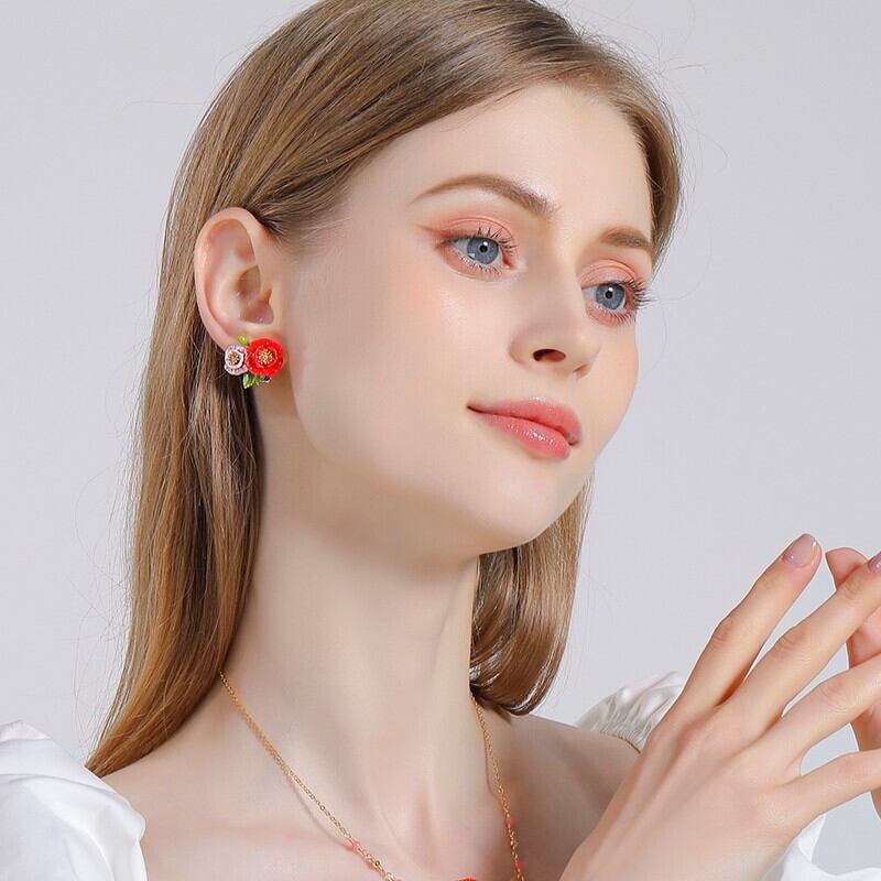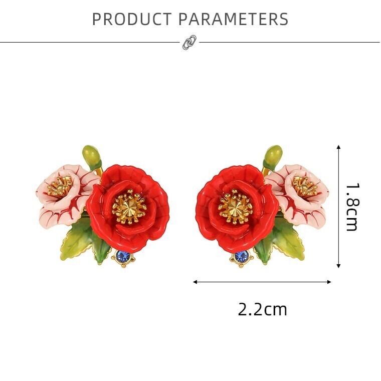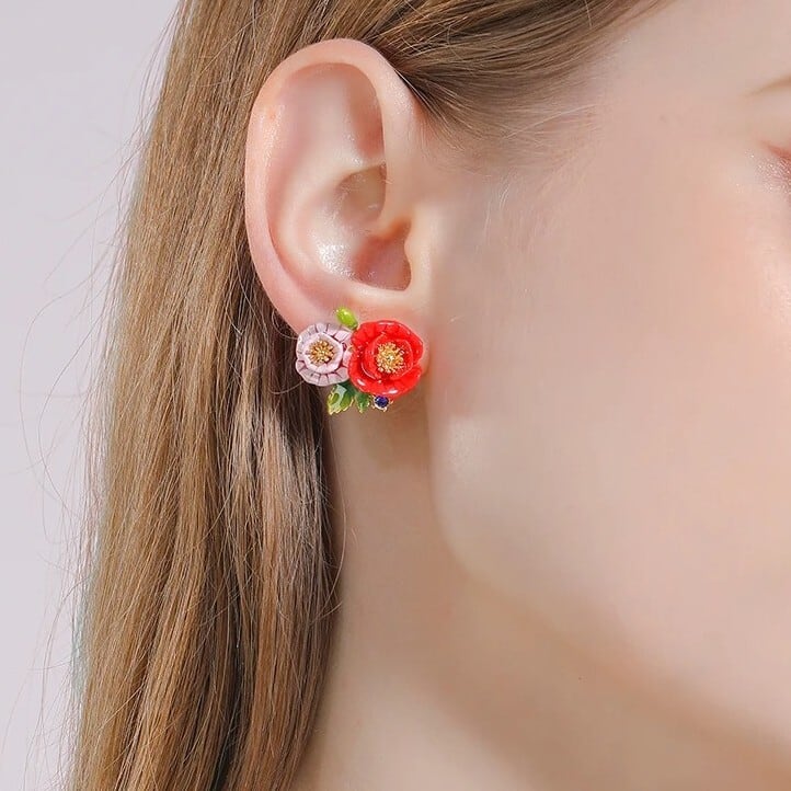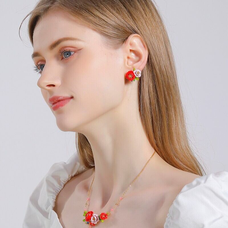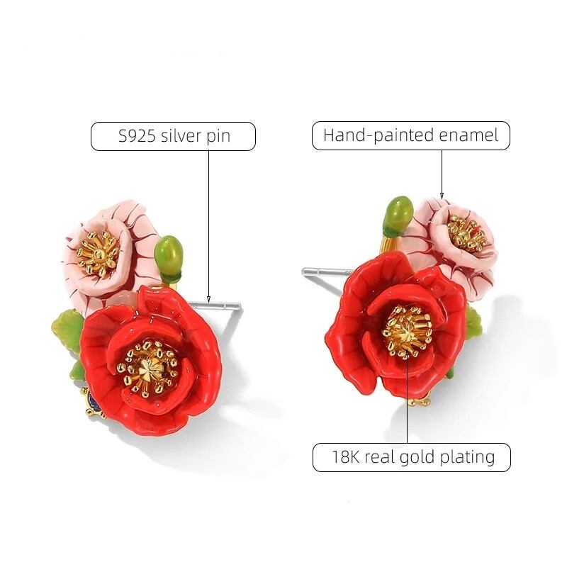 精巧な手描きのエナメル細工で、鮮やかな赤とピンク色の花が表現されています。