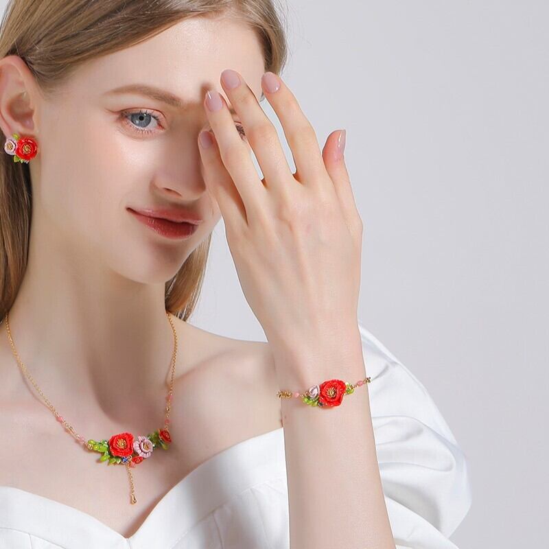 精巧な手描きのエナメル細工で、鮮やかな赤とピンク色の花が表現されています。