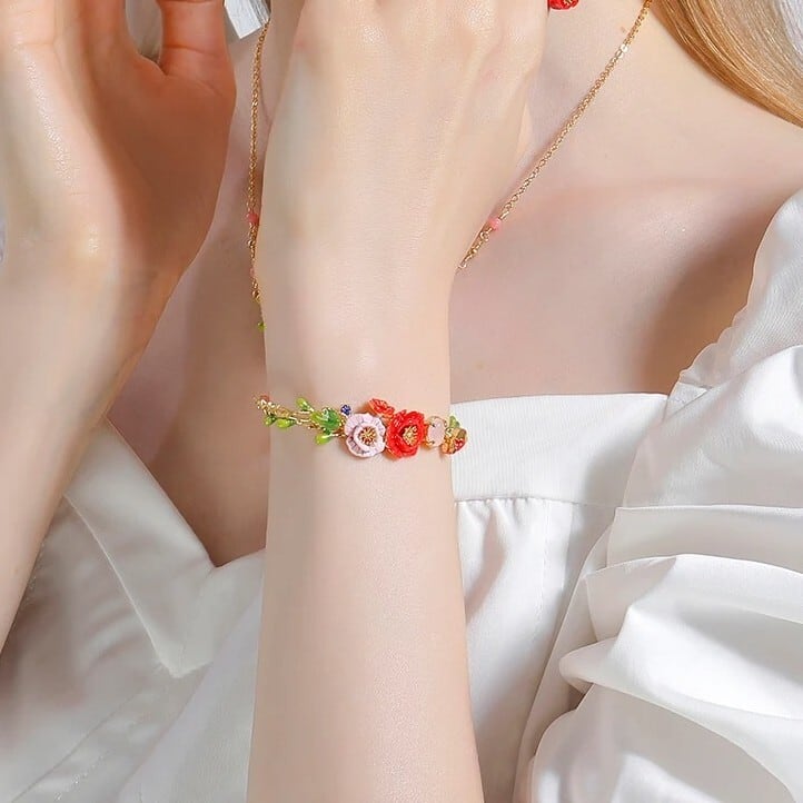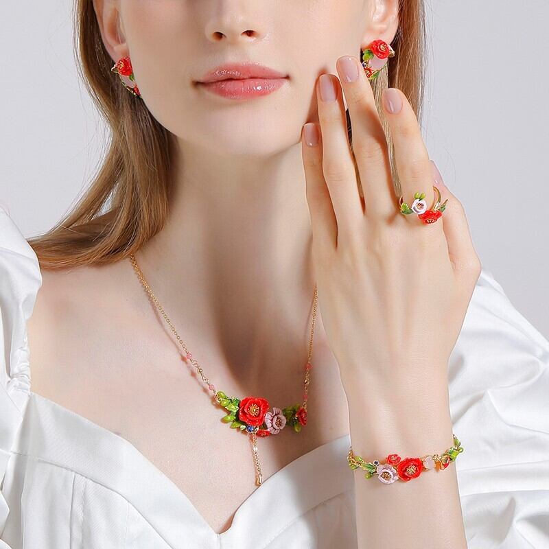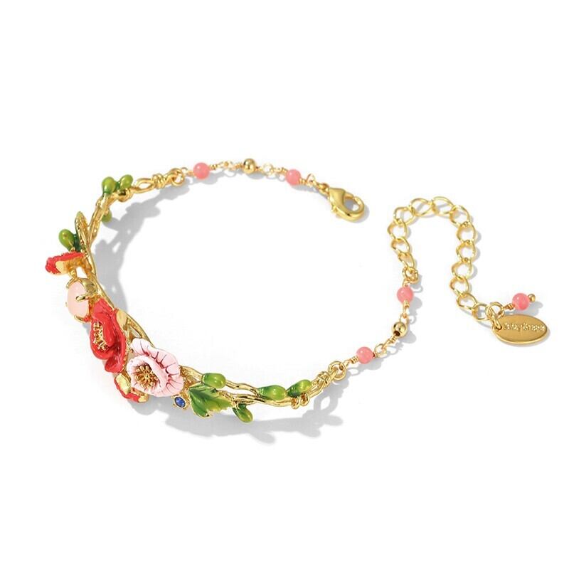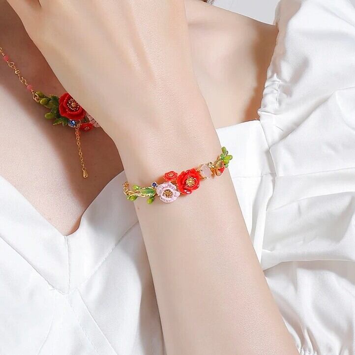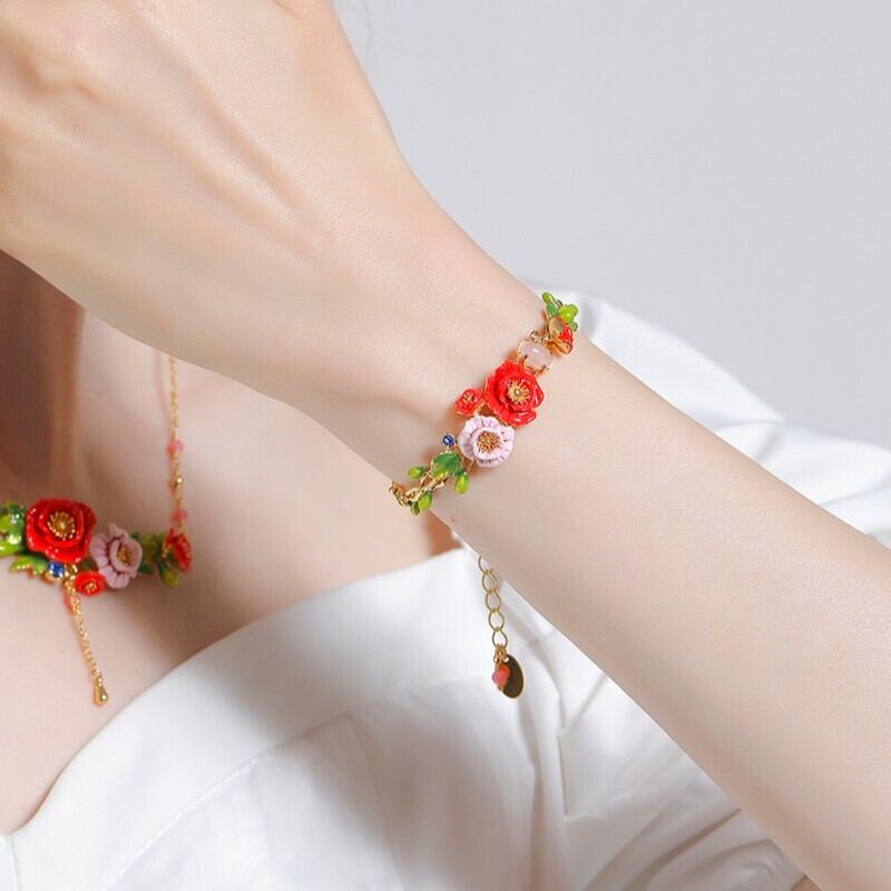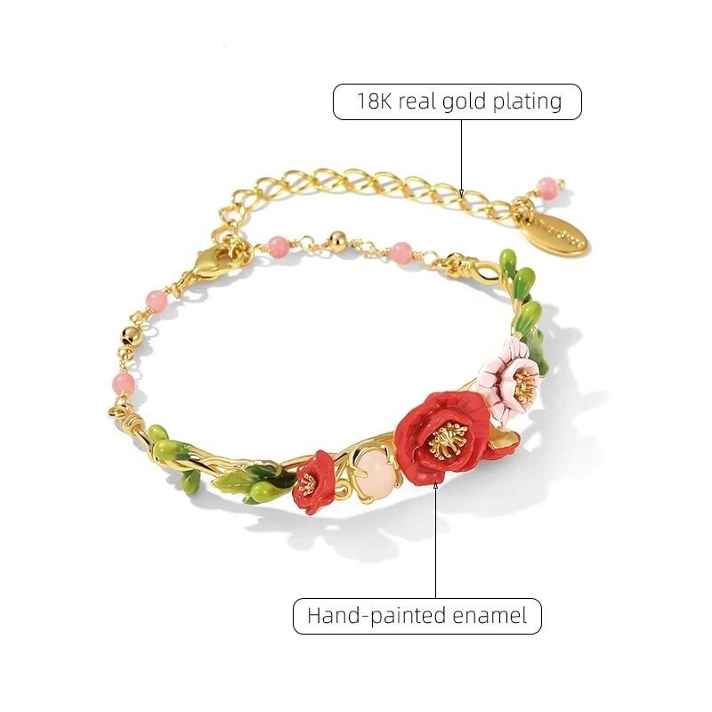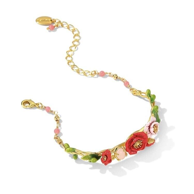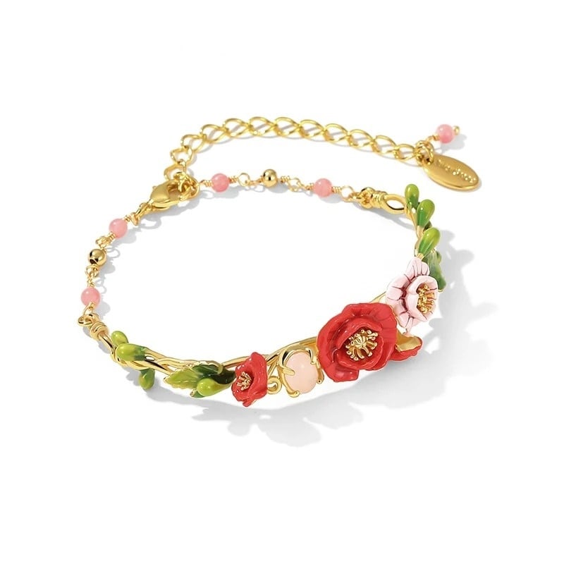 精巧な手描きのエナメル細工で、鮮やかな赤とピンク色の花が表現されています。