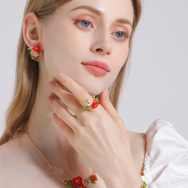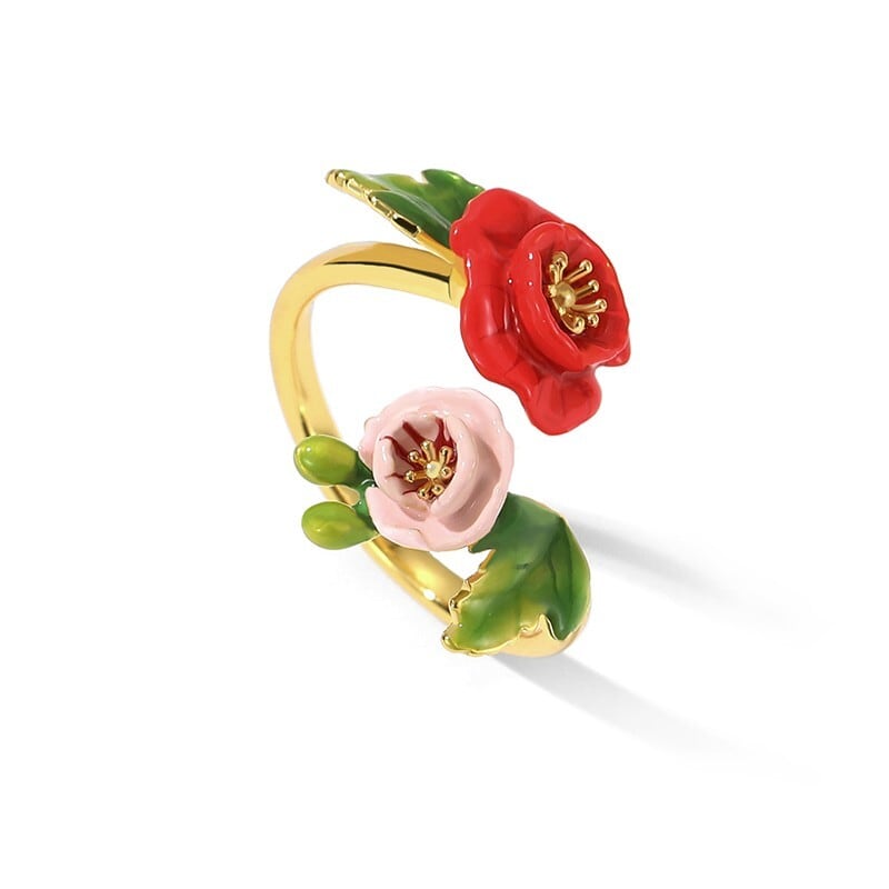 精巧な手描きのエナメル細工で、鮮やかな赤とピンク色の花が表現されています。